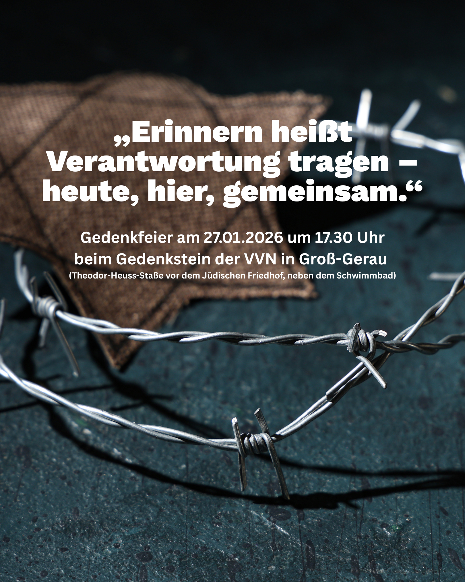 Die Gedenkfeier findet statt am Dienstag, 27. Januar 2026, dem nationalen Gedenktag an die Opfer der NS-Gewaltherrschaft und dem internationalen Holocaustgedenktag, um 17.30 Uhr beim Gedenkstein der VVN in Groß-Gerau (Theodor-Heuss-Straße vor dem Jüdischen Friedhof – neben dem Schwimmbad).